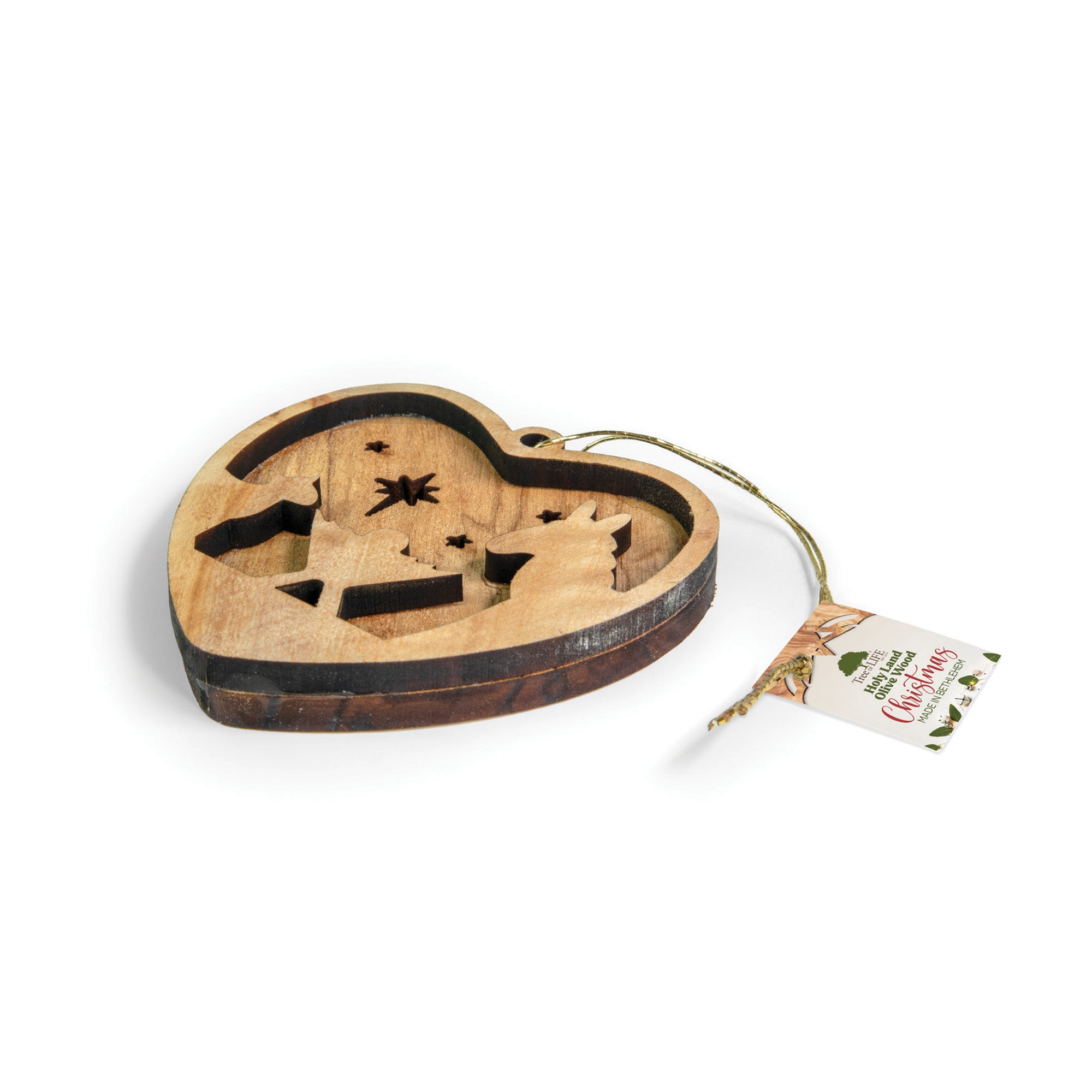 These layered, olive wood, laser-cut ornaments are crafted by local artisans in the Holy Land of Bethlehem. Each ornament is made from beautifully grained, locally sourced, and sustainably pruned olive wood. These wooden hanging ornament are a perfect addition to any tree, nativity set, or other holiday decoration or seasonal décor. Due to the natural variations in olive wood and the individuality of the artisans, each ornament is unique and will differ slightly in overall design.