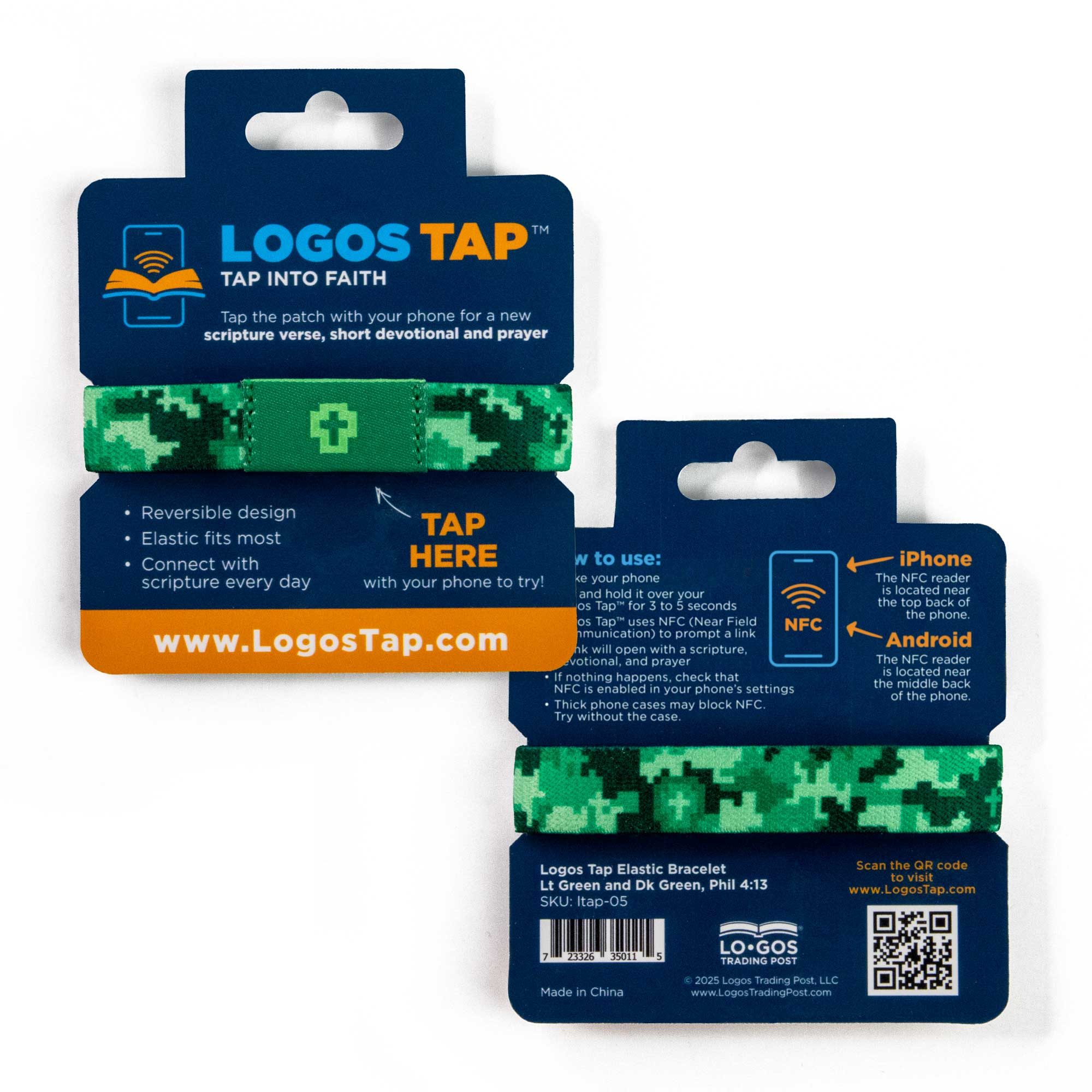 These stylish slim fitting, reversible, elastic wristbands are designed to fit most wrists. The Green Camo design lets you express your unique personality while the integrated NFC chip gives you quick access to a scripture, devotional and prayer anytime you need it. The center NFC patch features a Cross icon and the inside/reverse of the band has the scripture "I can do all things through Christ because he gives me strength. - Phil 4:13". The bracelet is both water-proof and durable without sacrificing comfort.