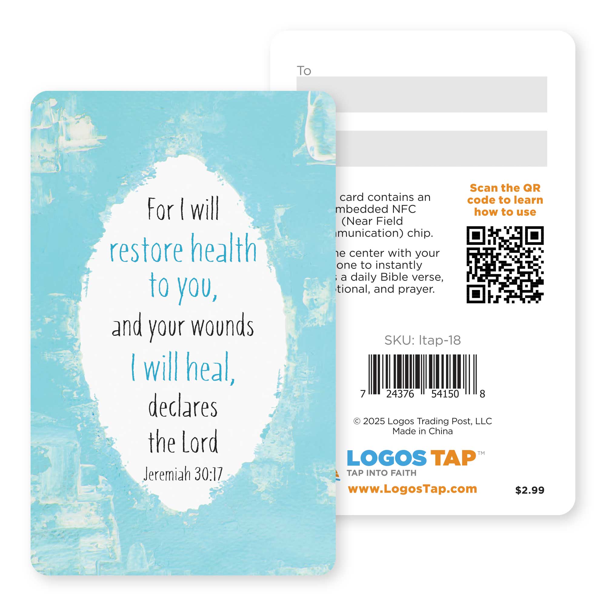 This durable plastic wallet cards fit in most wallets. The front design features a blue painted border and the scripture verse Jeremiah 30:17. The back has "To" and "From" boxes for easy gifting and a qr code that will take you to a video on how to use the card. The integrated NFC chip gives you quick access to a scripture, devotional and prayer anytime you need it.