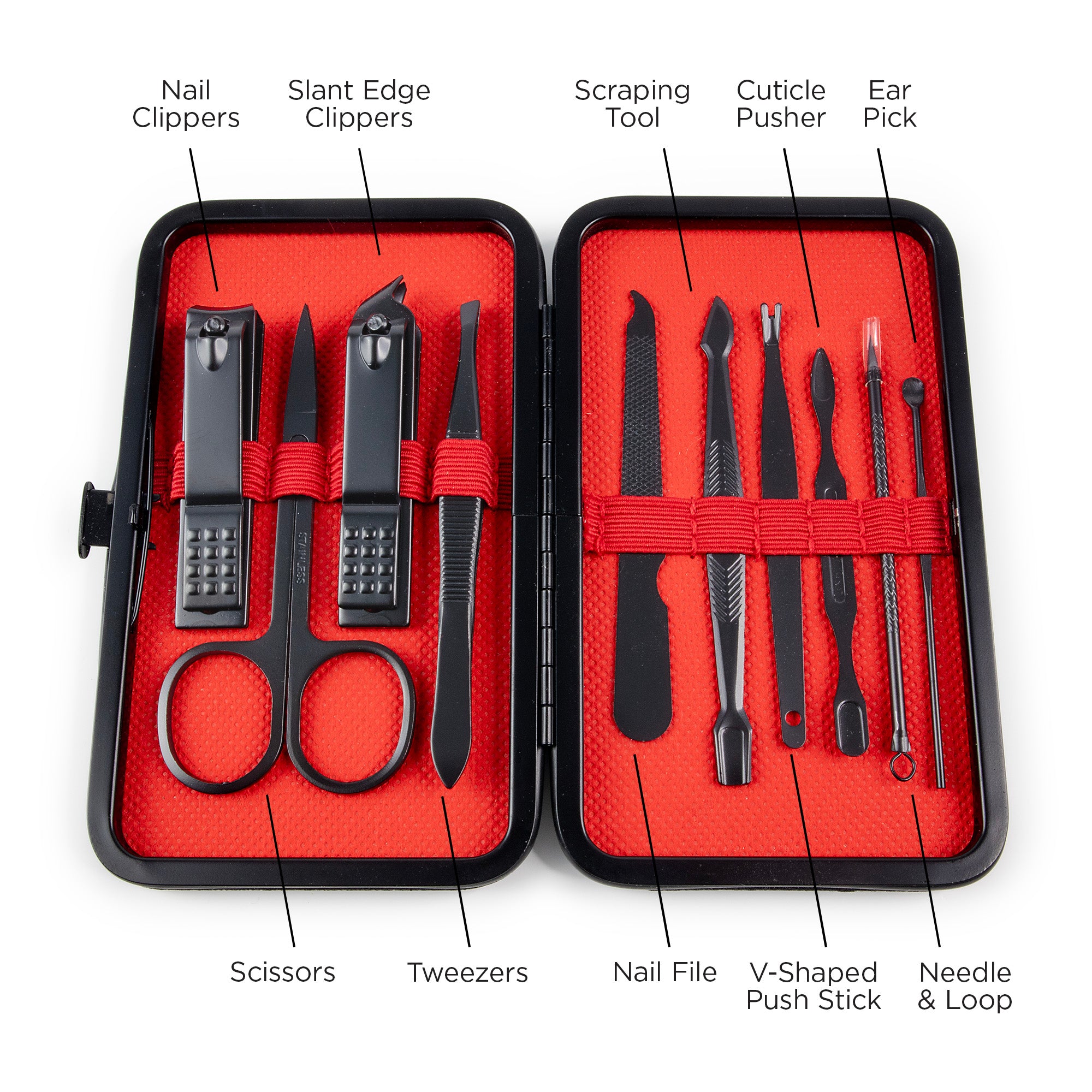 Stay inspired with these 10 Piece Scripture Manicure Sets. Crafted from stainless steel, each set includes nail clippers, scissors, slant edge clippers, tweezers, nail file, scraping tool, v-shaped push stick, cuticle pusher, needle and loop, and curette within a travel case.