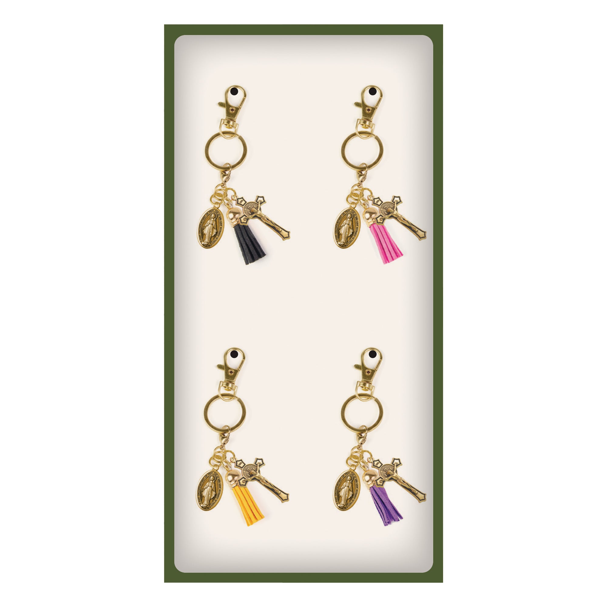 These elegant Tassel Key Rings are the perfect accessory for your keys or purse. Each key ring features a gold colored St Benedict Cross and Miraculous Medal along with a colorful tassel. Attach the key ring with the lobster clasp or ring.